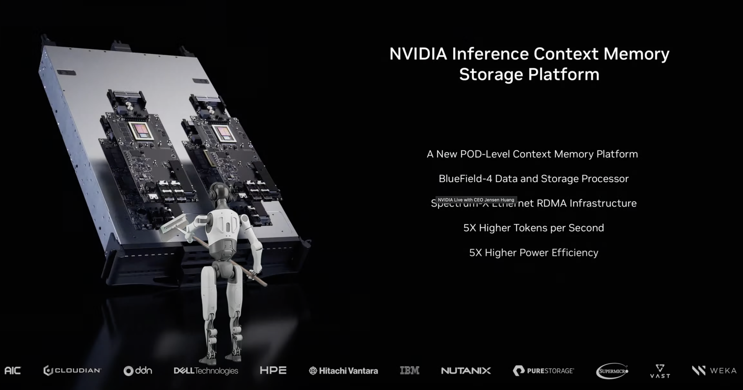 Storage partners, including VAST Data, NetApp, DDN, Dell Technologies, HPE, Hitachi Vantara, IBM, Nutanix, Pure Storage, and WEKA, are building platforms with BlueField-4. These will be available in the second half of 2026.