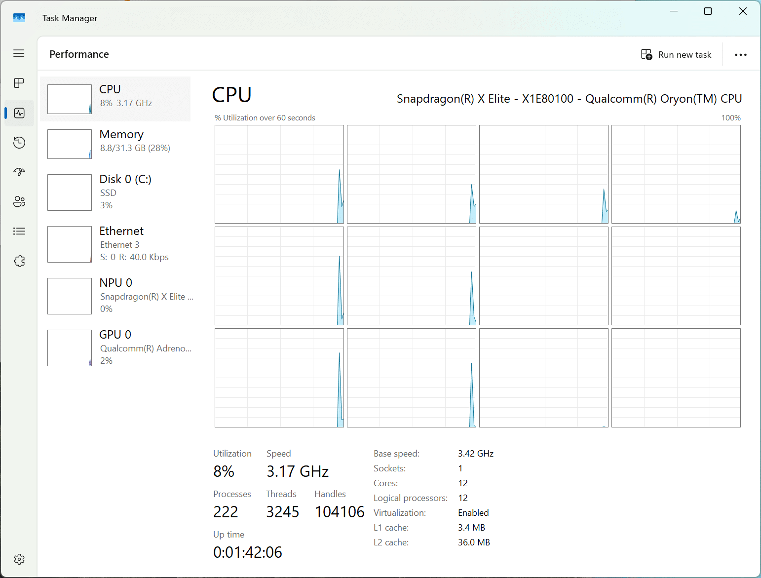 The Snapdragon X Elite line is built for professionals who need reliable performance without sacrificing efficiency. Our build uses the X1E-80-100 model, with 12 cores and a boost clock of up to 4.0 GHz. This makes it well-suited for multitasking, running intensive productivity tasks, and managing AI-enhanced applications. It’s an excellent choice for users who need to manage complex workflows, whether juggling multiple apps or relying on tools like Microsoft Copilot to automate tasks and boost productivity.