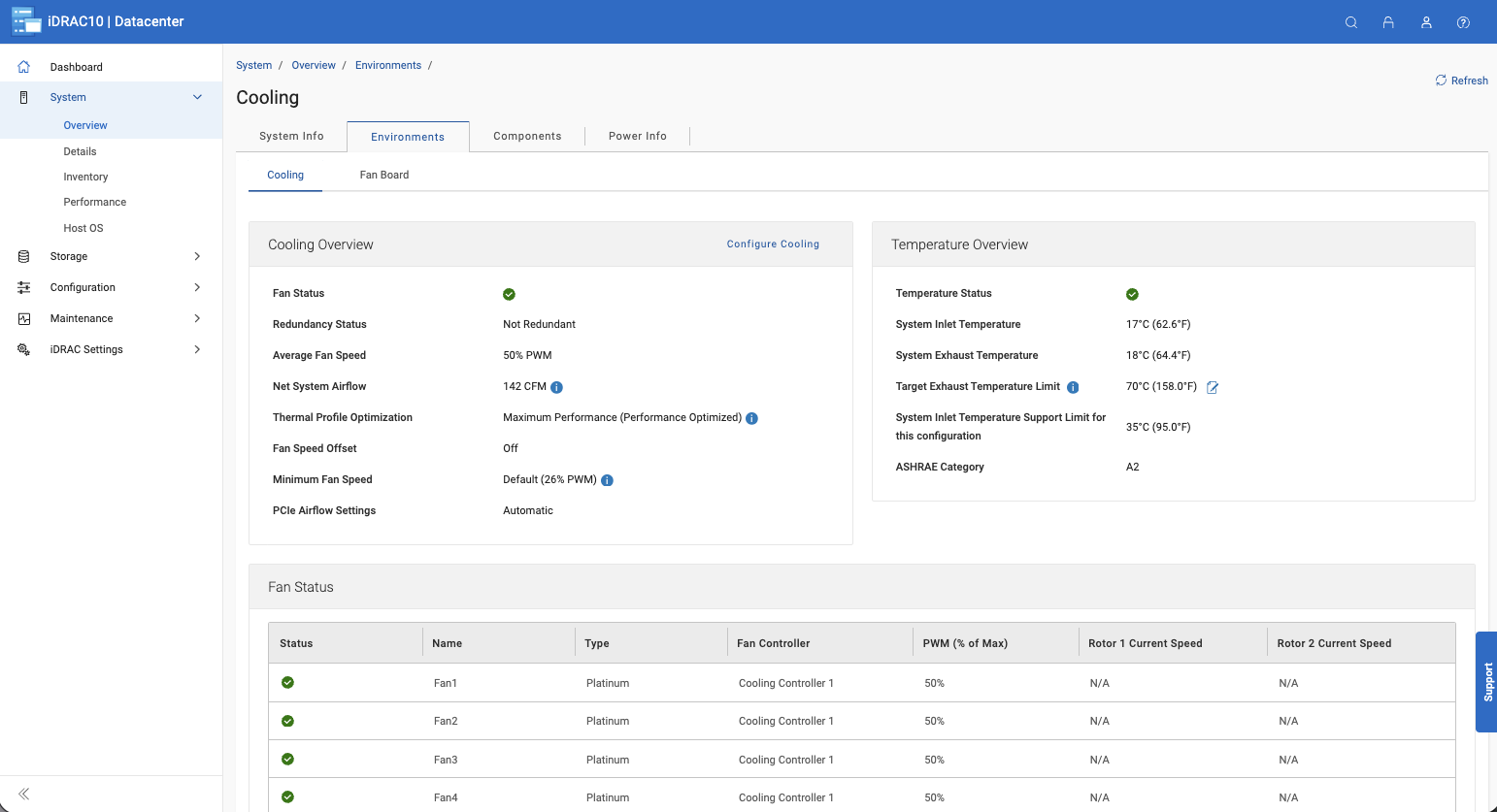 Drilling into the System Environments section reveals cooling details, including individual fan status, PWM speeds, thermal profile settings, and inlet temperature readings, all in real time. This is especially useful for validating airflow in dense rack configurations or troubleshooting thermal issues without needing physical access to the server.