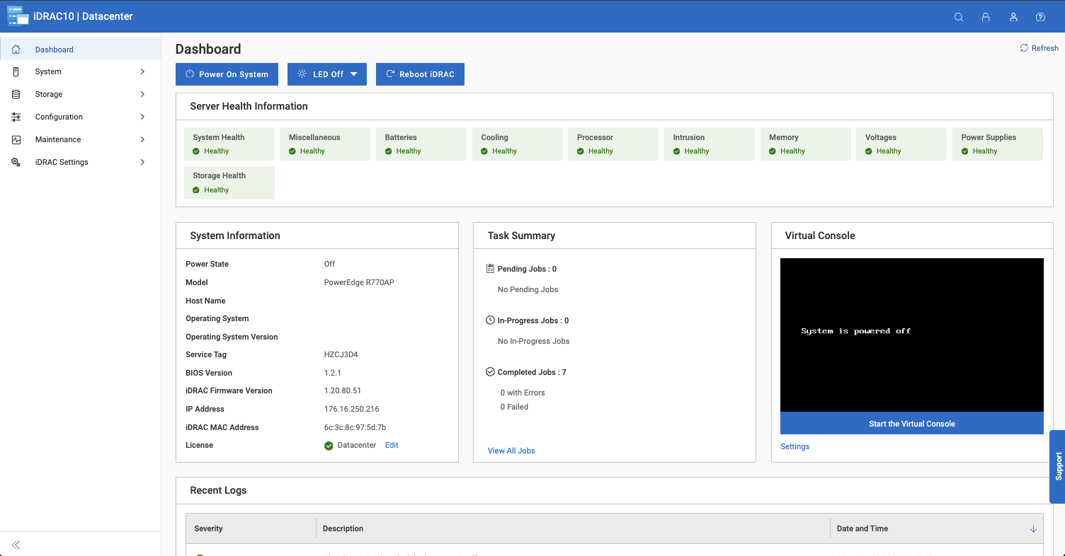 Remote management for the R770AP is handled by iDRAC10, the same platform Dell ships as standard across its entire 17th-generation PowerEdge lineup, including the PowerEdge R770 and PowerEdge R7725 we previously reviewed. The interface is consistent across the portfolio, so administrators already familiar with iDRAC on other PowerEdge platforms will feel right at home.