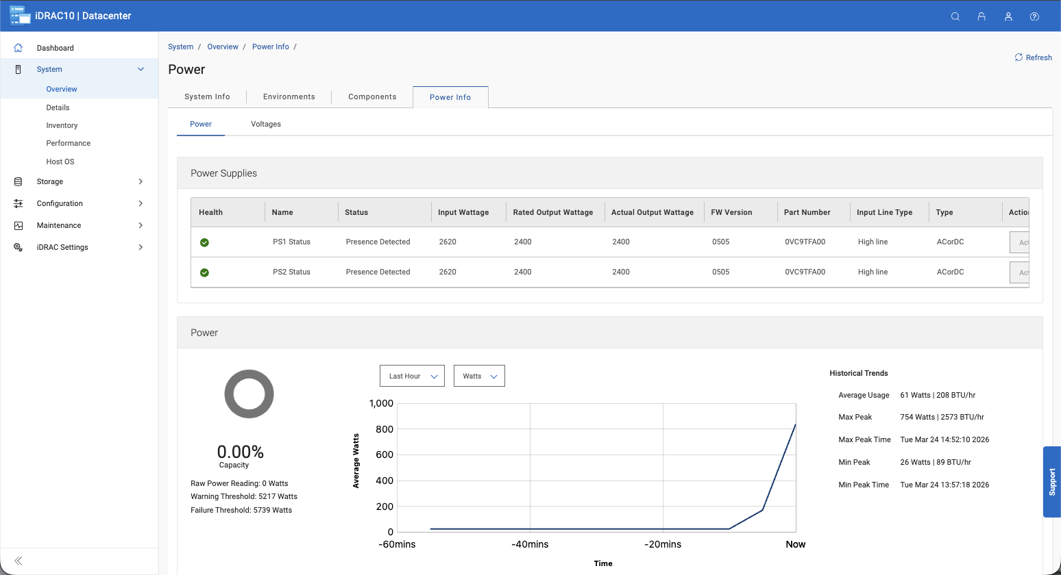 Power visibility follows the same pattern. The Power Info section breaks down PSU health, current draw, and capacity utilization alongside a rolling historical trend graph. Administrators can quickly see average and peak wattage over time, which is valuable for capacity planning and identifying workload-driven power spikes without needing a separate power monitoring tool.