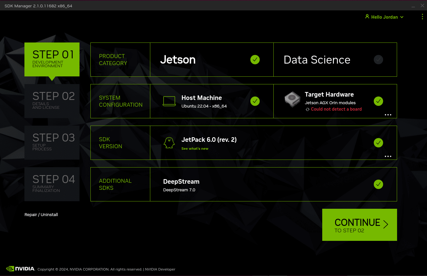 This step is to confirm that you have all of your ducks in a row. Confirm your product, system configurations, SDK version, and additional SDKs. For our setup, we used the Jetson AGX Orin Development Kit, Ubuntu 22.04, JetPack 6.0, and Deep Stream 7.0.