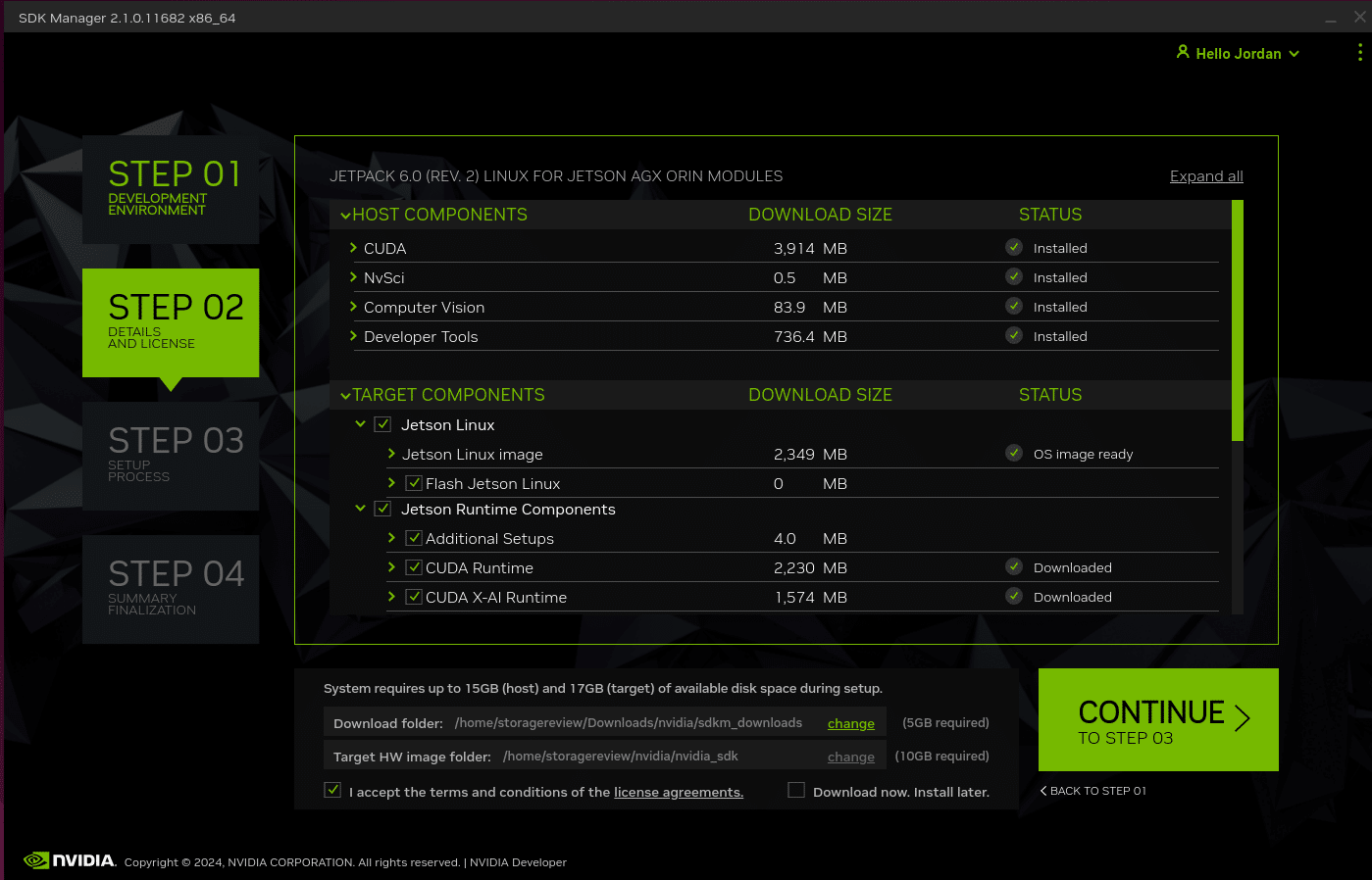 This step serves as an installation screen, ensuring that all Host components and target components are downloaded and installed. This is also the place to select the proper download location. The host system requires 15GBs of storage and the target system requires 17GBs of storage.