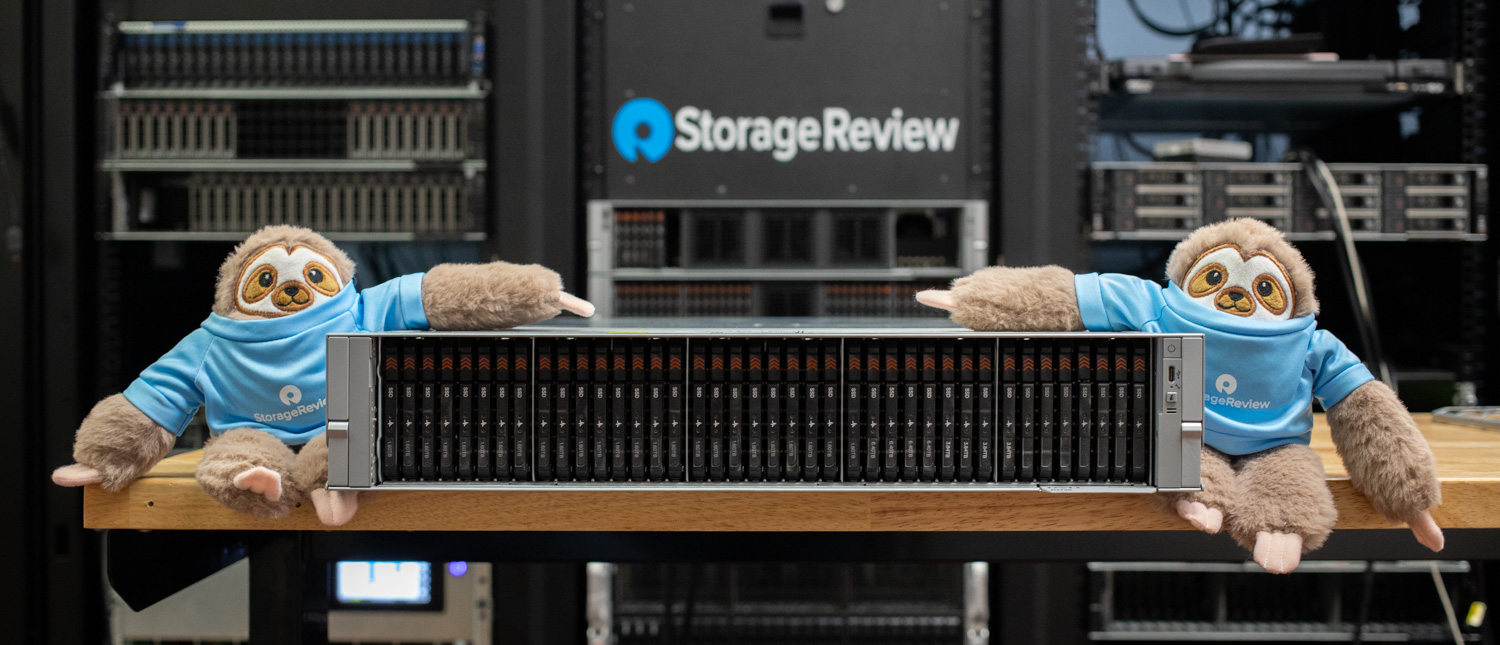 The Dell PowerEdge R7725 isn’t just a storage box; it also offers significant compute potential as a dual-socket AMD Turin platform. We leveraged 192-core AMD EPYC 9965 CPUs, totaling 384 cores. We also replaced the stock air-cooled heatsinks with liquid-cooled CoolIT SP5 cold plates, which were cooled by a CoolIT AHx10 Liquid-to-Air CDU. This combination kept the CPUs in higher sustained clock speeds, chassis fans operating at around 30% PWM, and our average system power consumption hovering around 1,600W.