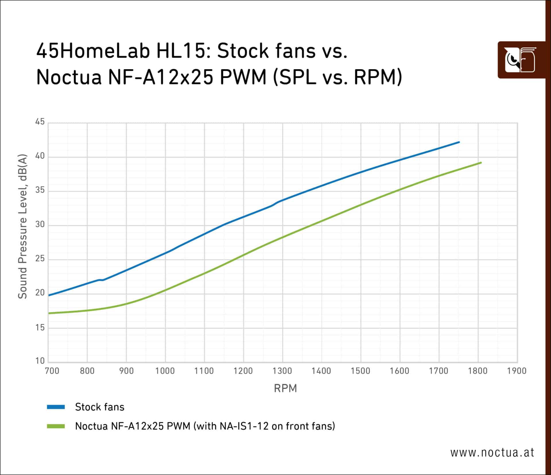 To quantify the noise levels, Noctua conducted a series of tests with the case fully closed and a decibel meter positioned in front of the center of the front panel. Here are the results: