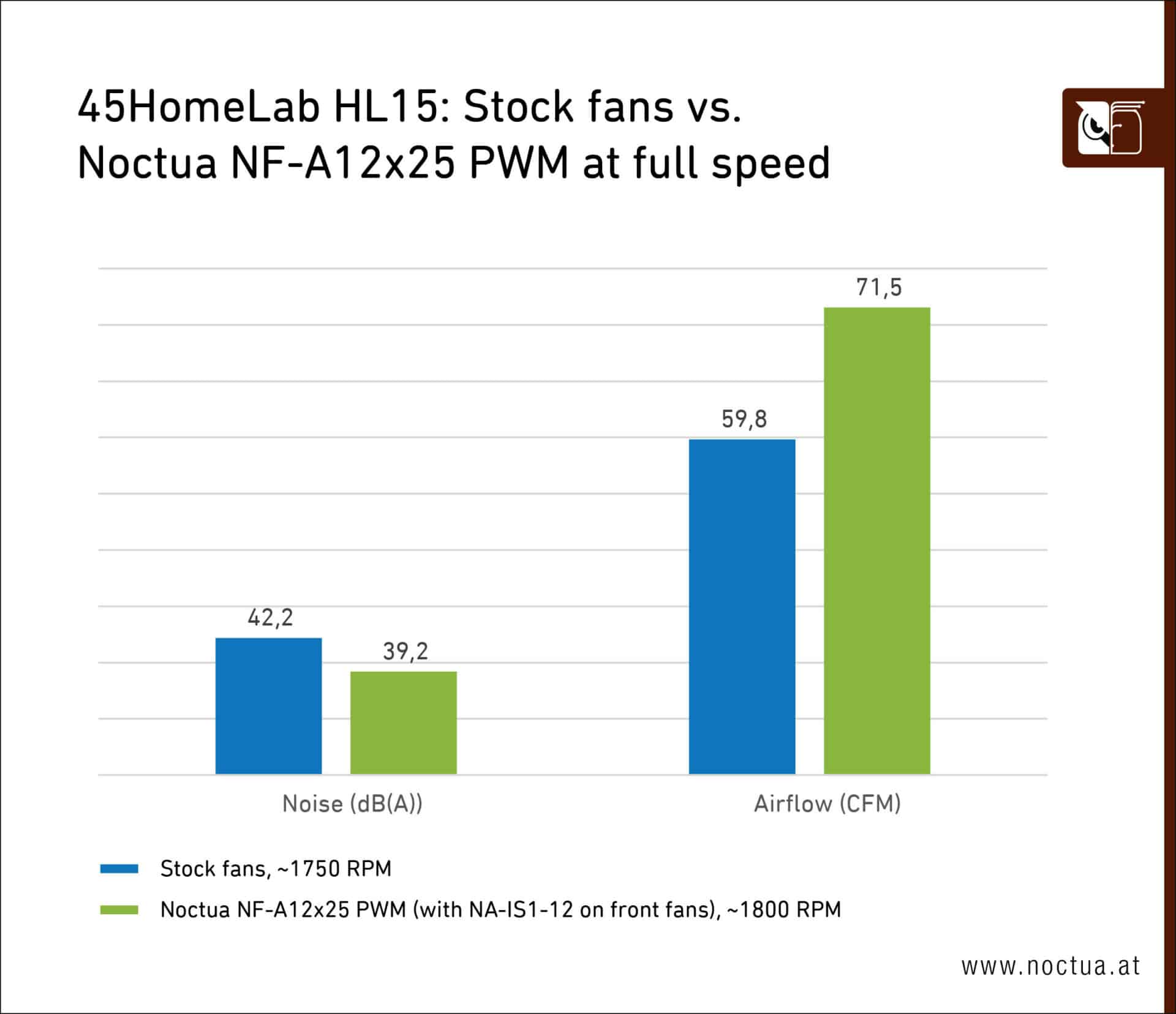 The Noctua fans, known for their industry-leading silent operation, live up to their reputation in the HL15. Noctua lab tests reported a substantial noise reduction, with levels dropping by approximately 4-6 dB(A) depending on the fan speed. The decrease in noise output was particularly impressive, considering the test setup included 15 drives, which typically introduces significant airflow resistance. The HL15 with Noctua fans achieved this while maintaining excellent cooling performance, thanks to increased airflow through the chassis compared to the stock fans.