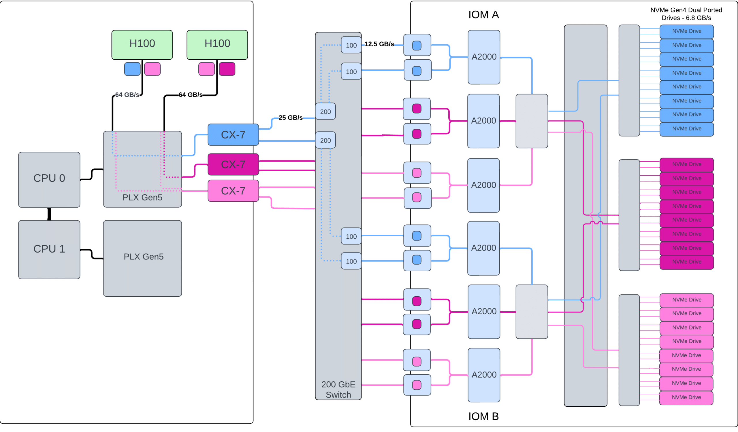 Each NVIDIA H100 is connected via a PCIe Gen5 x16 slot, which can theoretically achieve 64GB/s of bandwidth bidirectionally. Each 200GbE and 100GbE RNIC port can theoretically reach 25 GB/s and 12.5 GB/s respectively. A critical design consideration is to ensure a non-blocking architecture. This requires that the GPUs, RNICs, and NVMe-oF drives are all mapped physically on the same CPU, NUMA, and PLX switch. This allows the configuration to take full advantage of GPUDirect. As seen in this implementation, a mirrored configuration on the second CPU, NUMA, and PLX switch would allow a predictable compute scale and a theoretical doubling of performance.