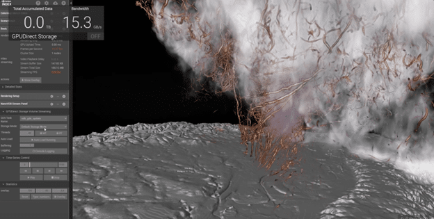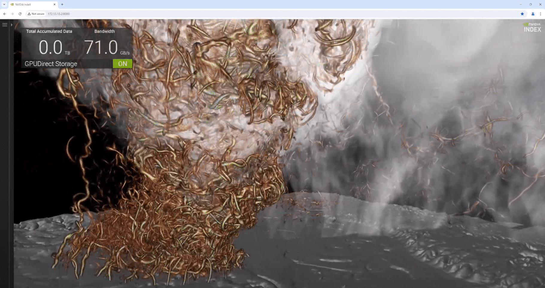 Key to this simulation is NanoVDB, a compact sparse-volume data structure that reduces dataset sizes and memory footprint by mapping data directly into the GPU’s memory. Coupled with GPUDirect Storage technology and the OpenFlex Data24, we achieved up to 89GB/s and can view results at over 13 frames per second. This approximated to about 5.9TB of dataset ingested every 66 seconds. This combination allows for interactive navigation, on-the-fly parameter adjustments, and scrubbing through the simulation with ease.