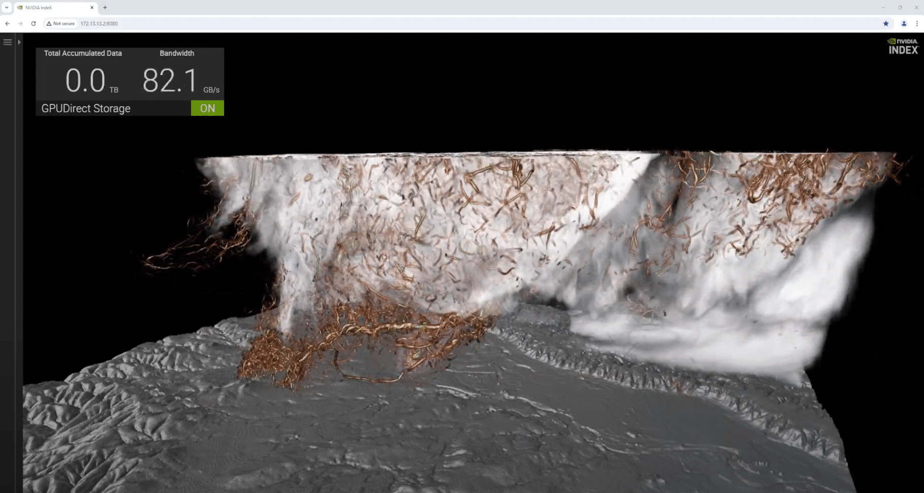 To stretch the legs of the OpenFlex Data24, we had to pull together a few key pieces: NVIDIA GPUDirect™, NVIDIA IndeX®, and a whopping 5.9TB of Tornado Simulation data. By leveraging NVIDIA GPUDirect, we enabled direct communication between the GPU memory and the OpenFlex Data24, drastically reducing latency and maximizing data throughput. Utilizing NVIDIA’s IndeX allowed us to visualize and interact more efficiently with the massive tornado dataset, showcasing the system’s real-time processing capabilities. This setup provided a perfect testbed for demonstrating OpenFlex Data24’s ability to handle intensive AI workloads and large-scale data processing with remarkable speed and efficiency.